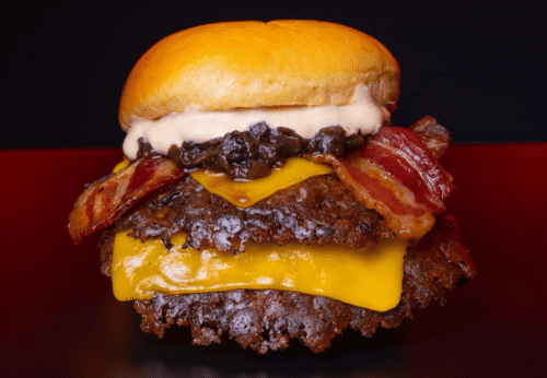 Pan brioche, cebolla morada caramelizada, x2 smash vacuno madurado, x2 cheddar ingles madurado, x2 bacon crujiente, pepino holandés encurtido en vodka y vinagre, salsa de mayo kimchi