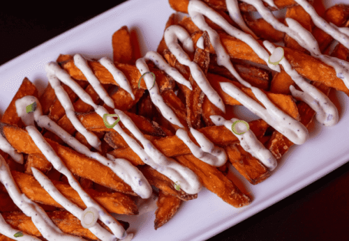 Patatas fritas acompañadas de Pulledpork casero, cebolla crunx y salsa chipotle